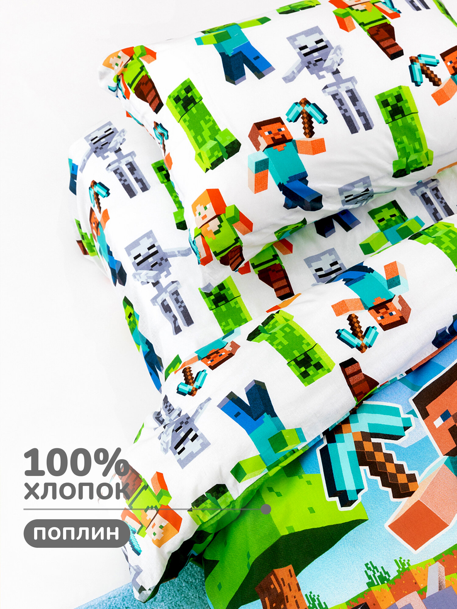 Отзывы на Детское постельное белье 1,5 спальное Майнкрафт Juno, поплин хлопок, 1 наволочка 70х70, Пиксельная вселенная неон Майнкрафт