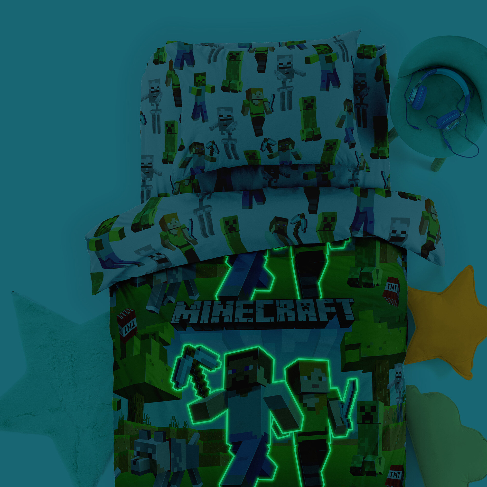 Детское постельное белье 1,5 спальное Майнкрафт Juno, поплин хлопок, 1 наволочка 70х70, Пиксельная вселенная неон Майнкрафт информация: