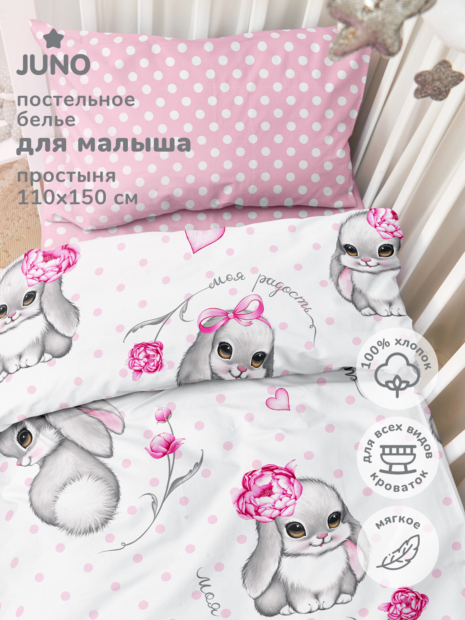 Постельное белье детское 160х80 юниор Juno, поплин хлопок, 1 наволочка 40х60, детское постельное белье в кроватку Милые зайки, комплект для малыша, для девочки 1 160 ₽
