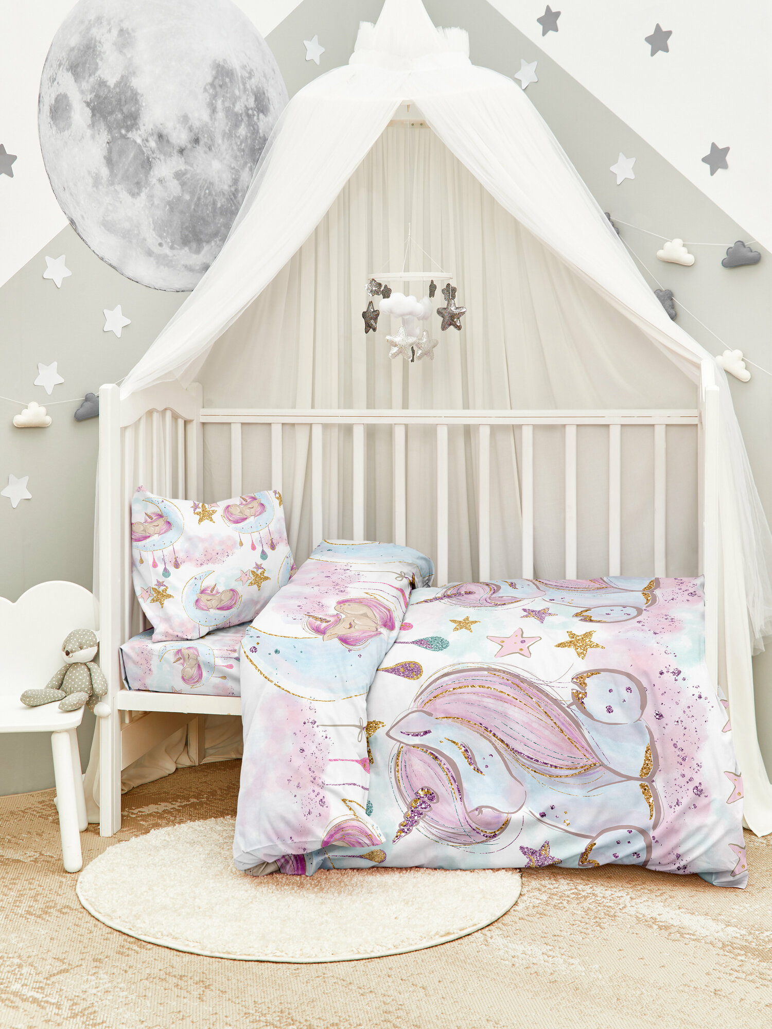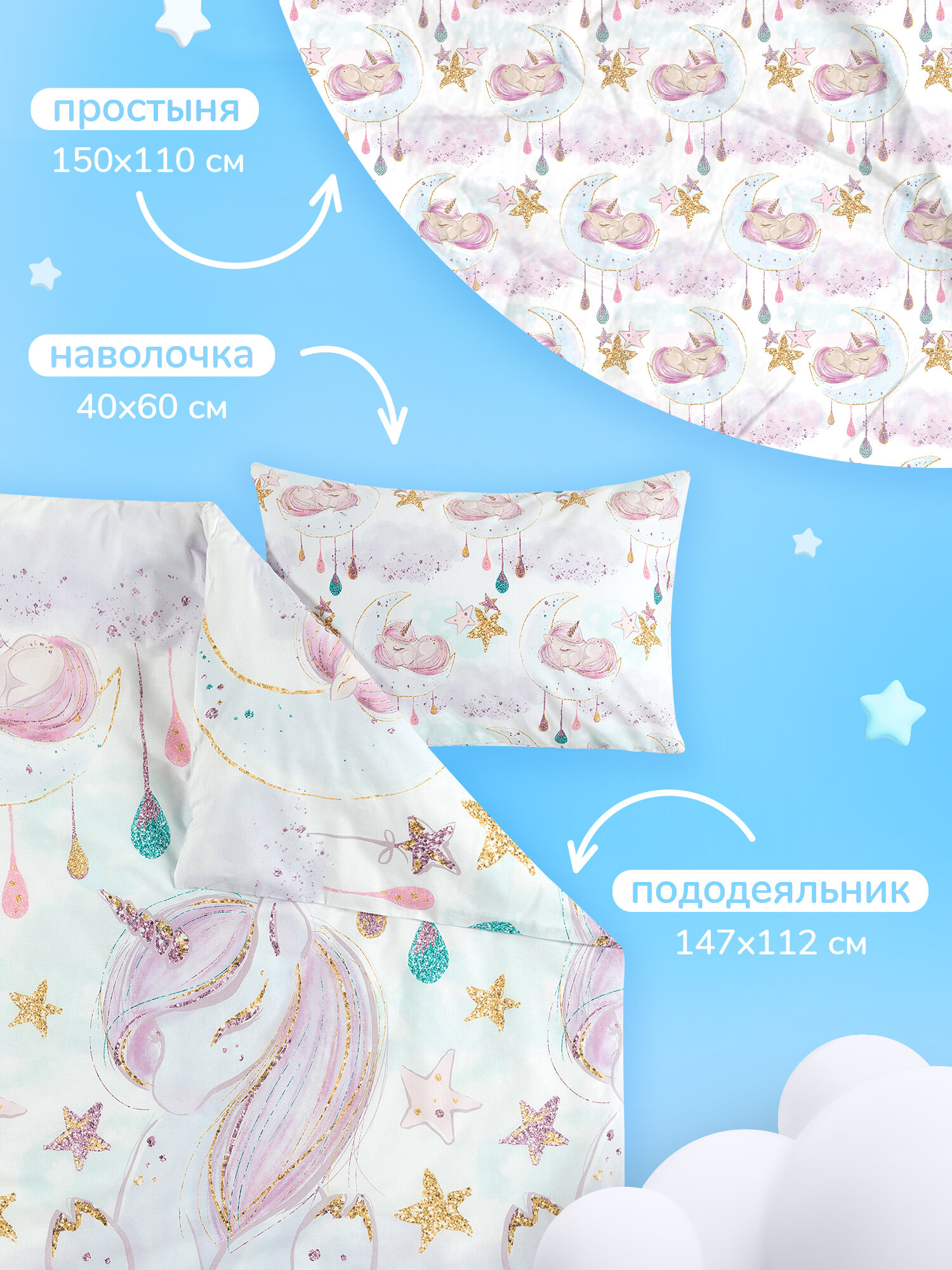 Постельное белье детское 160х80 юниорjuno, поплин хлопок, 1 наволочка 40х60, детское постельное белье в кроватку Sleep Unicorn / Единорог, комплект для малыша, для девочки 1 124 ₽