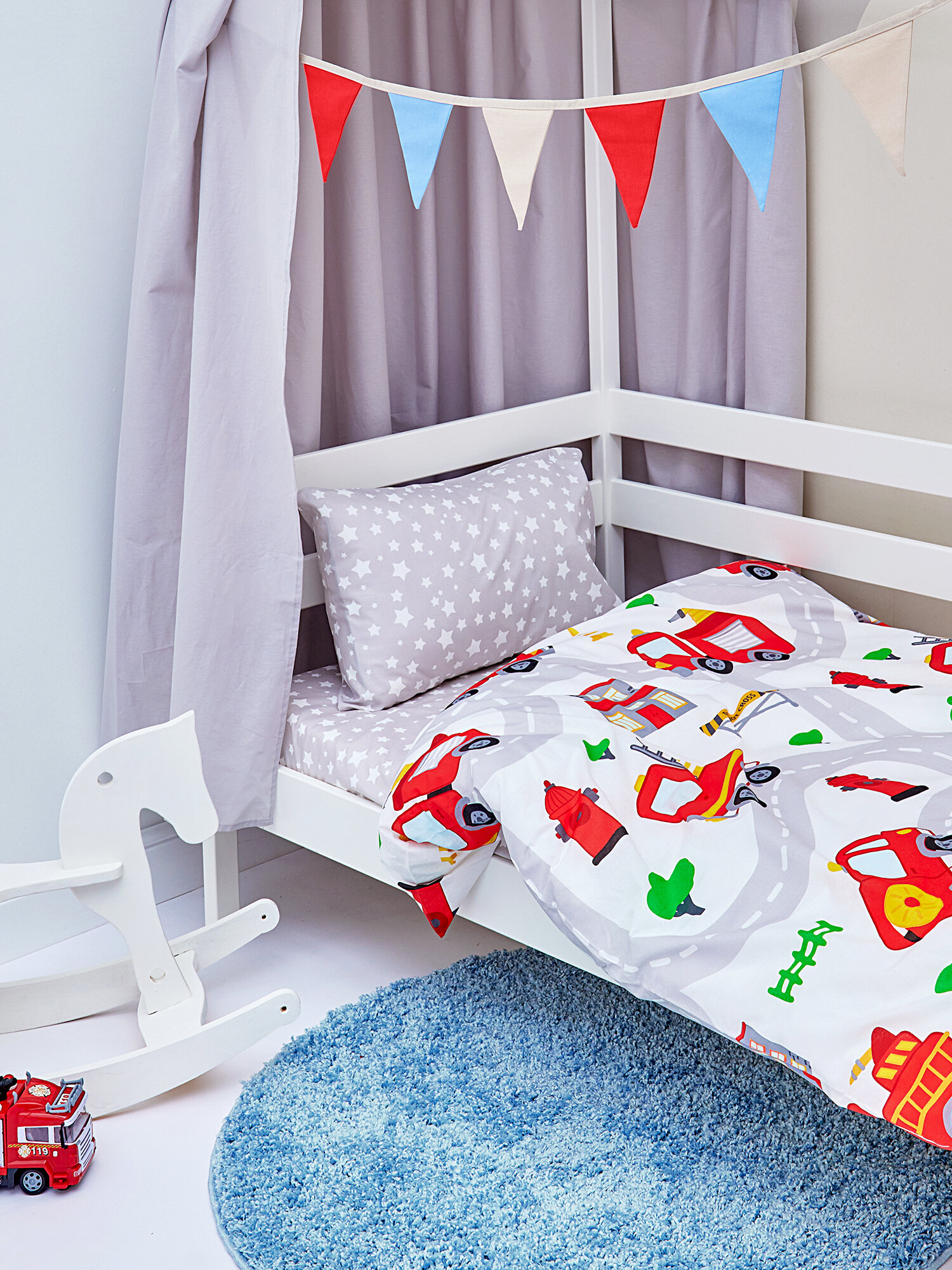 Постельное белье детское 160х80 Juno, поплин хлопок, 1 наволочка 40х60, детское постельное белье в кроватку Пожарные машинки, комплект для мальчика информация: