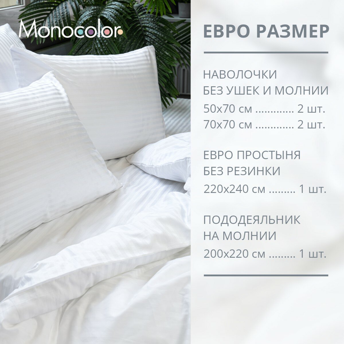 Комплект постельного белья Евро размер Monocolor Страйп сатин 100% хлопок / 4 наволочки /белый /премиум качество информация: