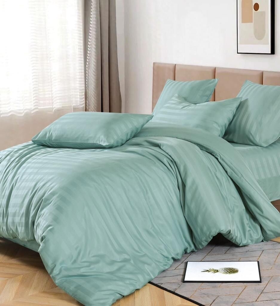 Постельное белье евро 2 спальное фисташковый Mency Страйп сатин простынь 180x200+25 на резинке информация: