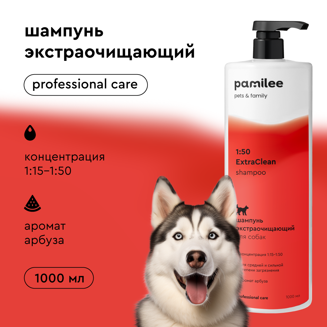 Шампунь для собак Pamilee 1:50 ExtraClean, 1000 мл, экстраглубокое очищение шерсти всех типов, концентрат шампуня 1:50 информация: