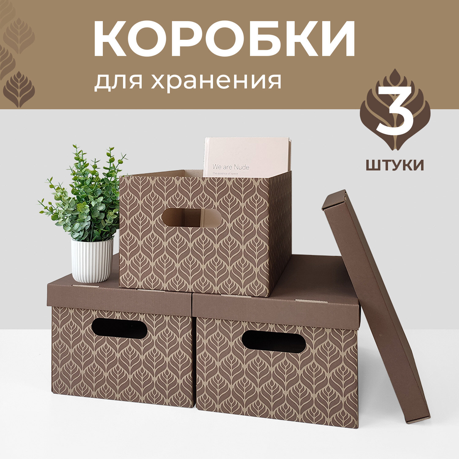 10 цен на Коробка для хранения вещей с крышкой картонная, 3 шт., Листья бежевые