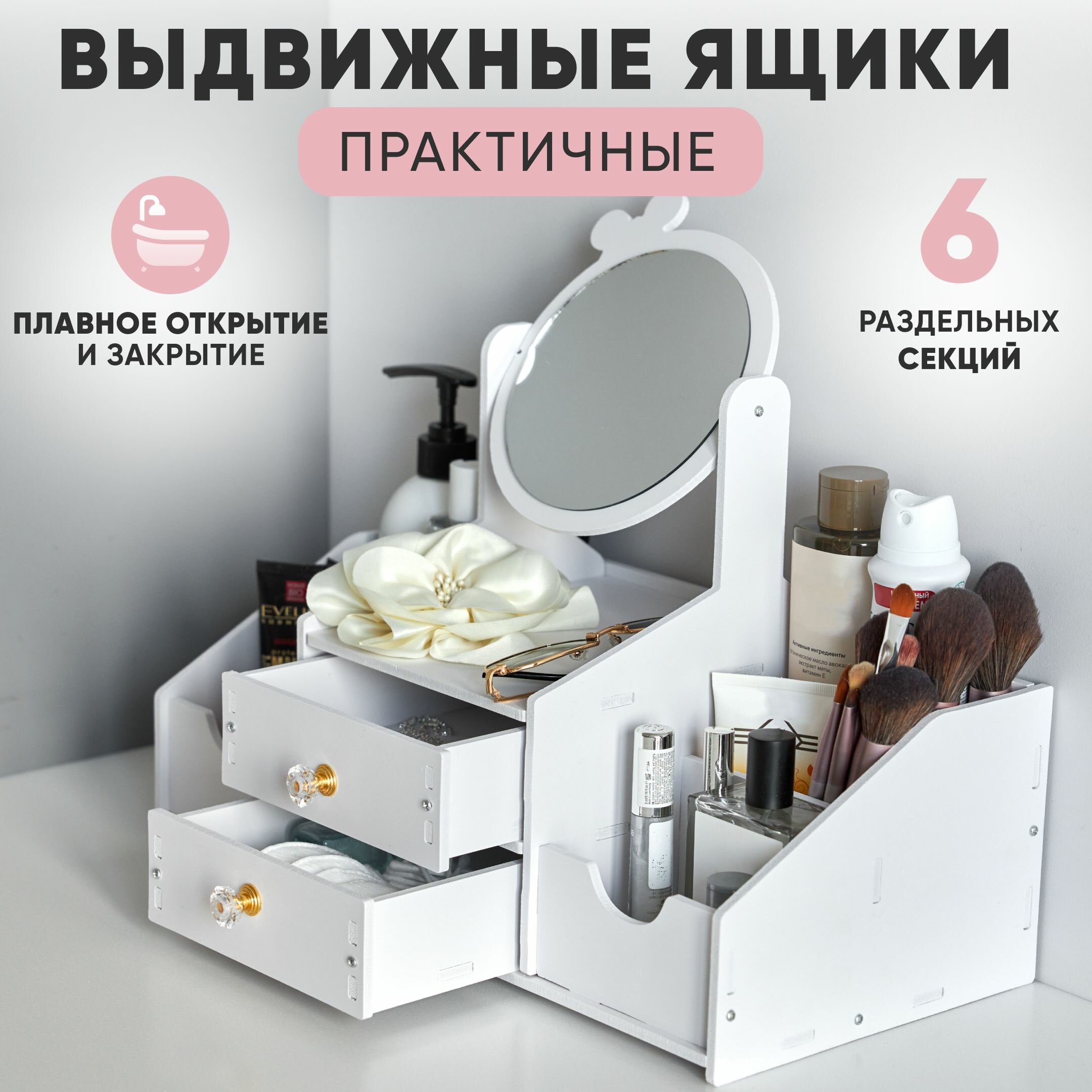 Отзывы на Органайзер для косметики с зеркалом Oqqi, большой, 6 секций, с выдвижными ящиками, 20х35,5х41 см, белый
