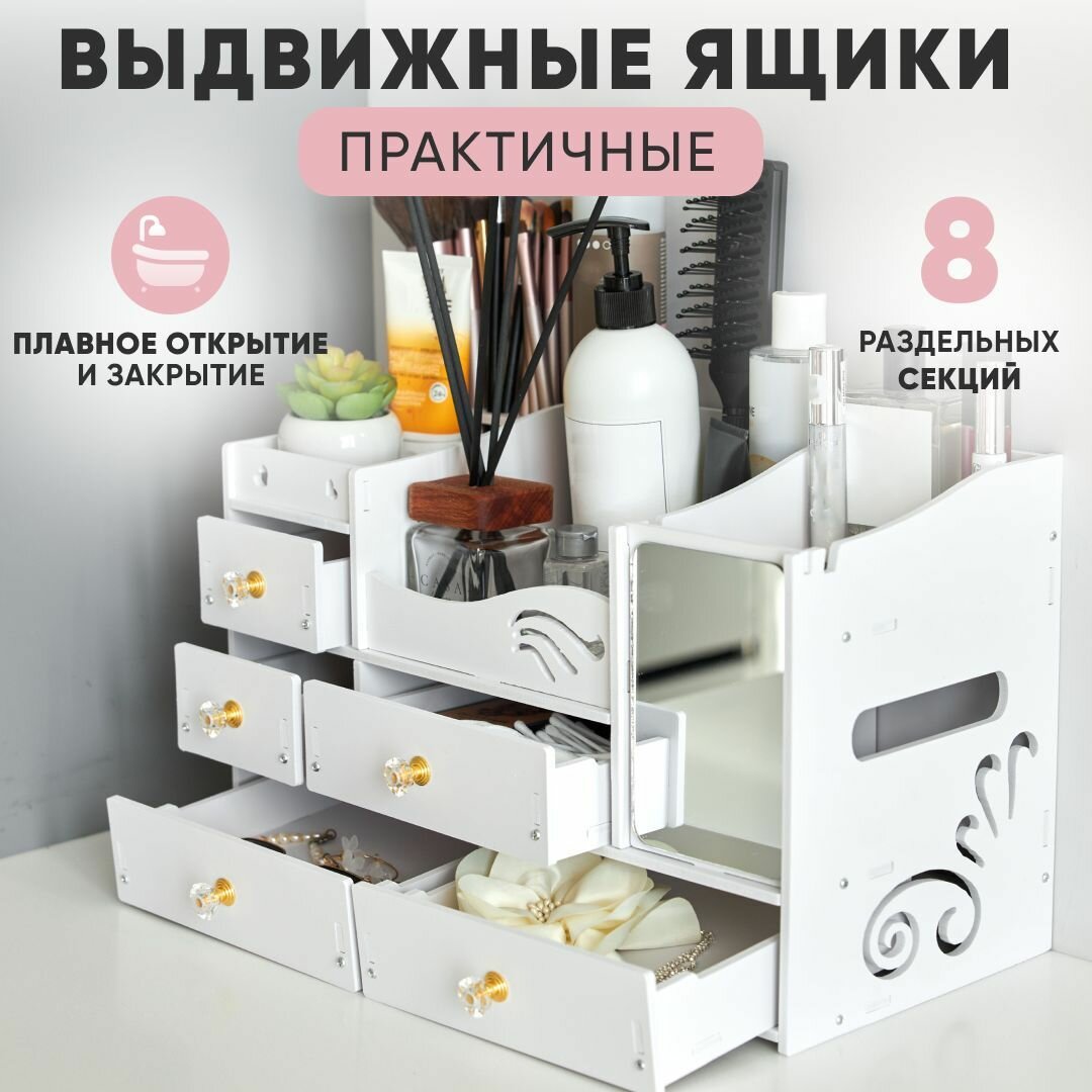Отзывы на Органайзер для косметики с зеркалом Oqqi, большой, 8 секций, с выдвижными ящиками, отделение для салфеток, 20х25х40 см, белый