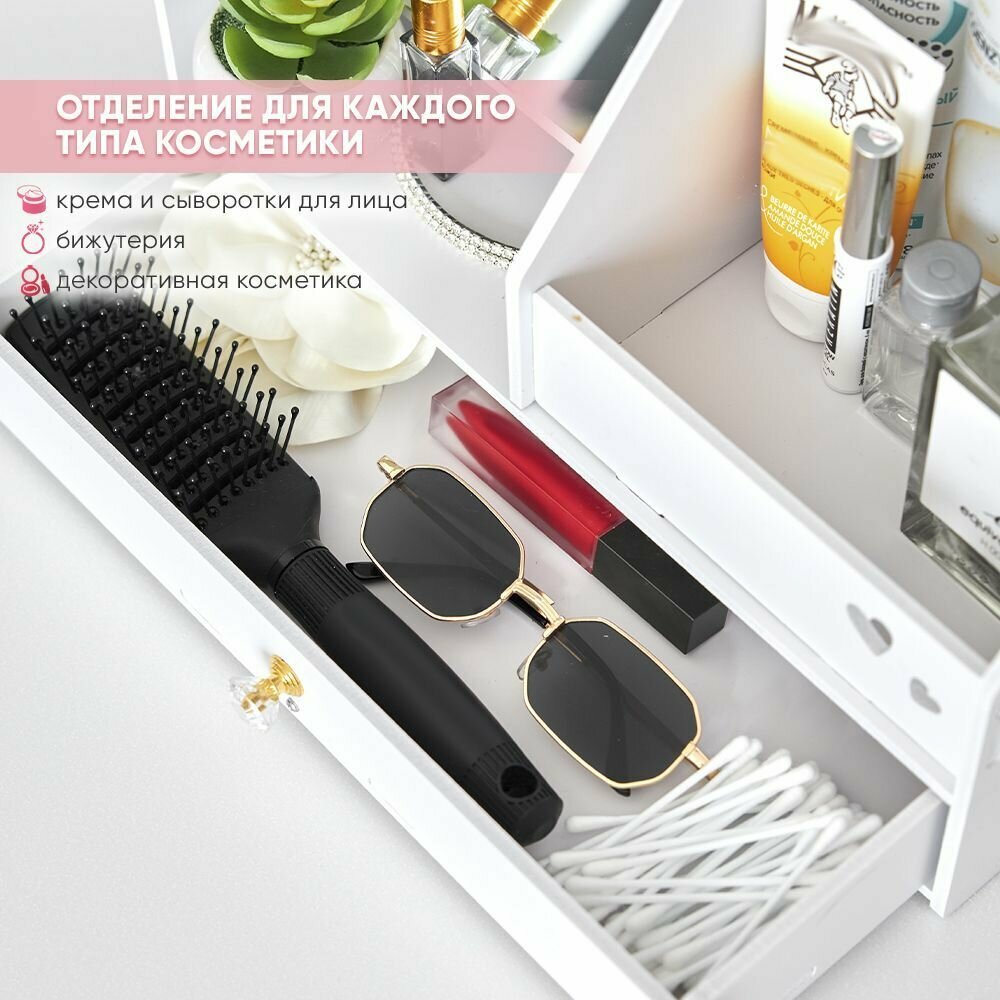 Органайзер для косметики с зеркалом OQQI, с выдвижными ящиками, 3 секции информация: