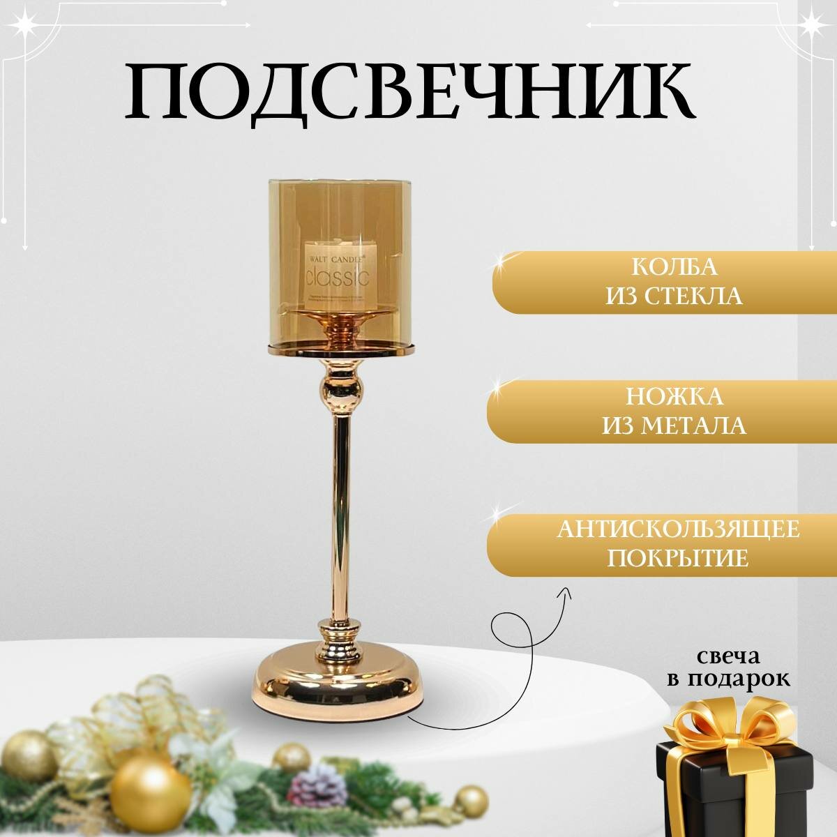 Подсвечник золотой высокий со свечой информация: