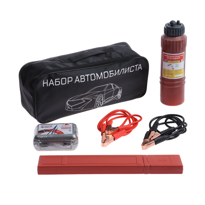 Набор автомобилиста №1П: провода прикуривания, знак аварийный, огнетушитель, аптечка информация: