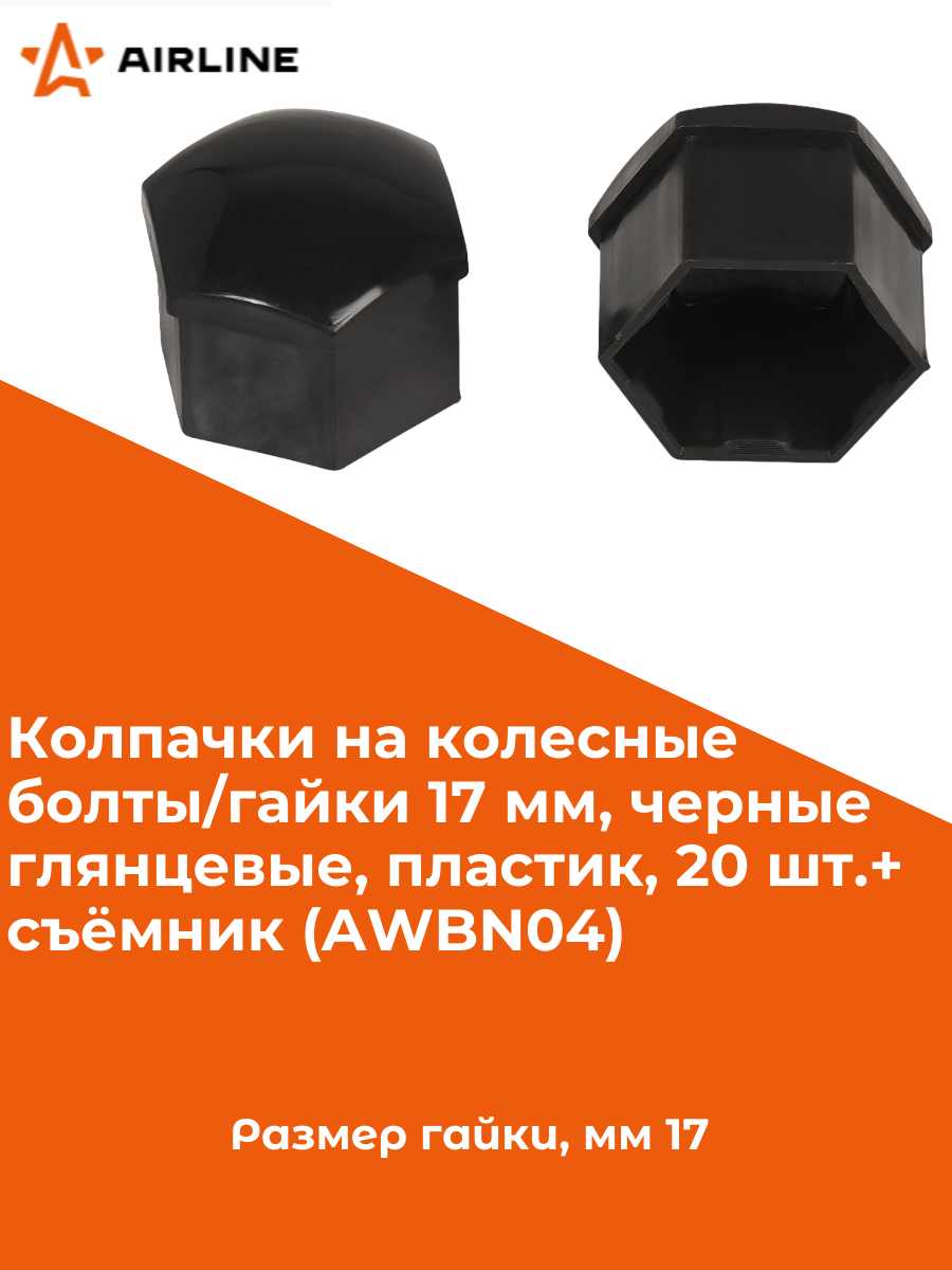 Колпачки на колесные болты/гайки 17 мм, черные глянцевые, пластик, 20 шт.+ съёмник AWBN04 AIRLINE