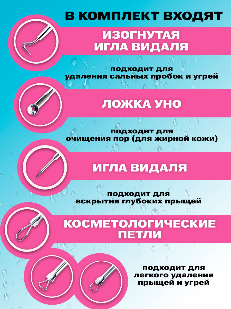 | Комплектность | Набор для чистки лица 1 шт; петля видаля; ложка уно; игла видаля; каретка |