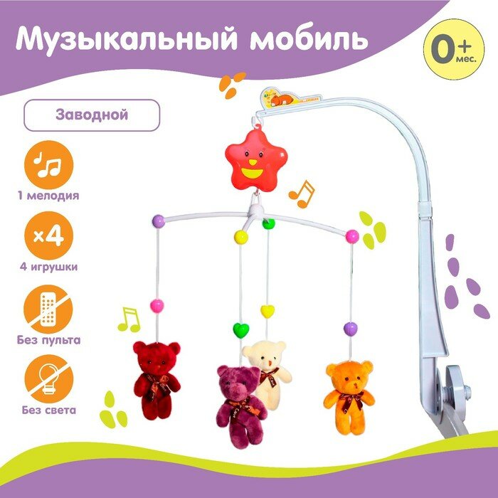Мобиль музыкальный на кроватку «Мишки Лав», заводной, с мягкими игрушками информация: