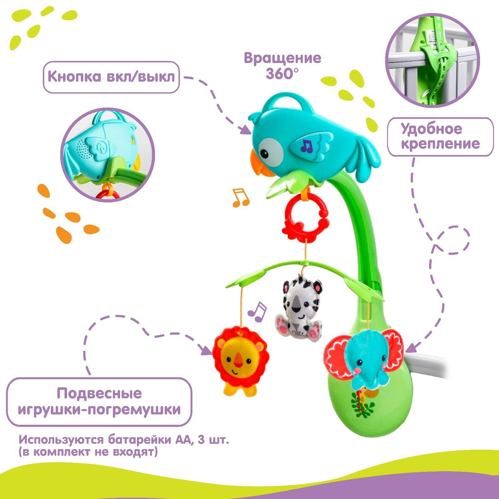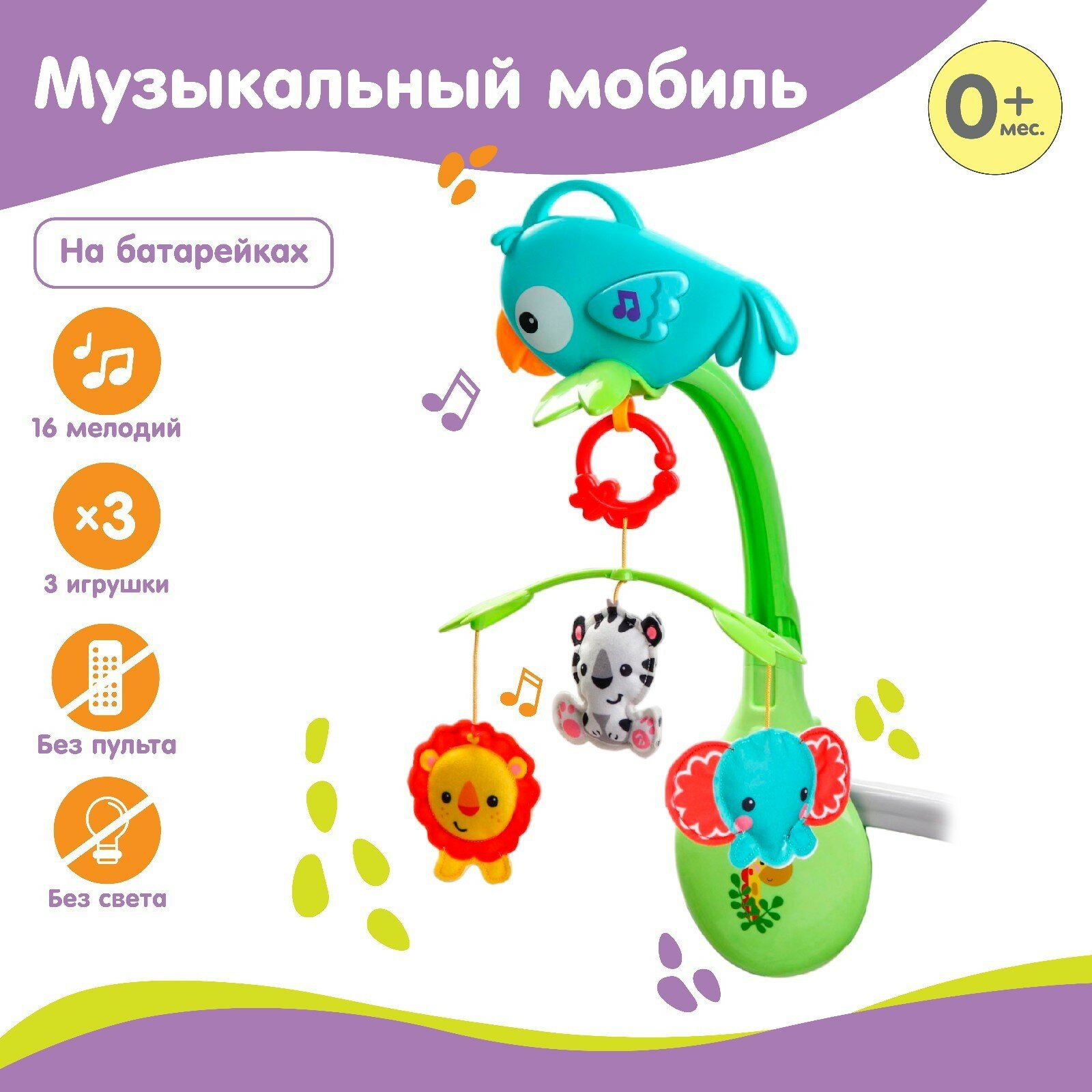 Отзывы на Мобиль музыкальный на кроватку «Тропический лес. Попугайчик», 3 игр., на батарейках, съемный муз.блок