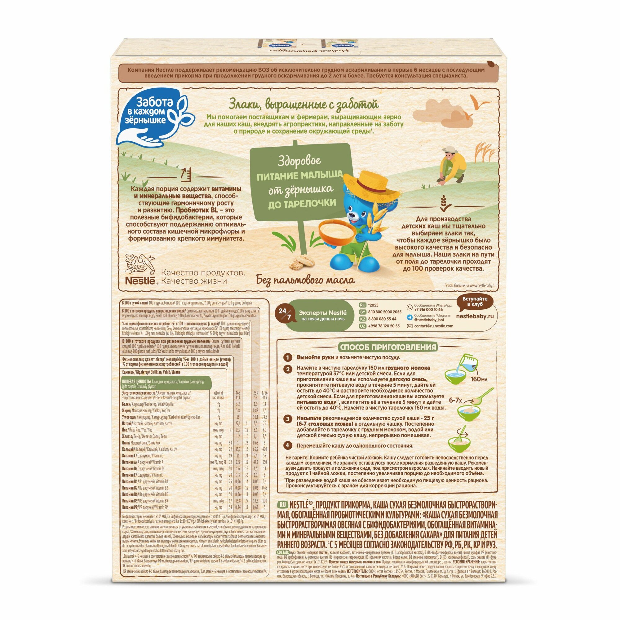 | Состав | мука овсяная (содержит глютен), кальция карбонат, витаминно-минеральный премикс (С (L-аскорбиновая кислота), E (DL-альфа-токоферола ацетат), цинка сульфат, РР (никотинамид), В2 (рибофлавин), A (ретинола ацетат), В6 (пиридоксин гидрохлорид), B9 (фолиевая кислота), йодид калия, В1 (тиамина мононитрат), D (D3 холекальциферол)), соль, железа (II) фумарат, бифидобактерии не менее 1х106 КОЕ/г. Продукт может содержать молоко и сою. |