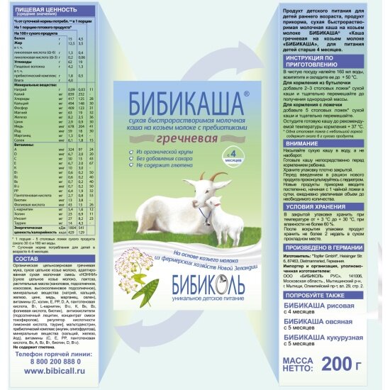 Каша на козьем молоке Бибиколь нэнни "Бибикаша" гречневая с 4 мес 200 г информация: