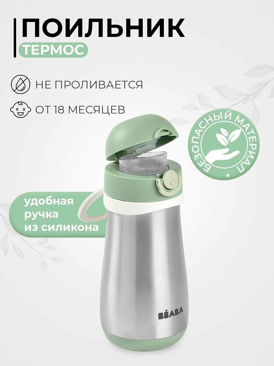 10 цен на Поильник термос детский BEABA с крышкой, адаптированным носиком, съемной ручкой, термос детский для воды 350 мл., зеленый, эвкалипт