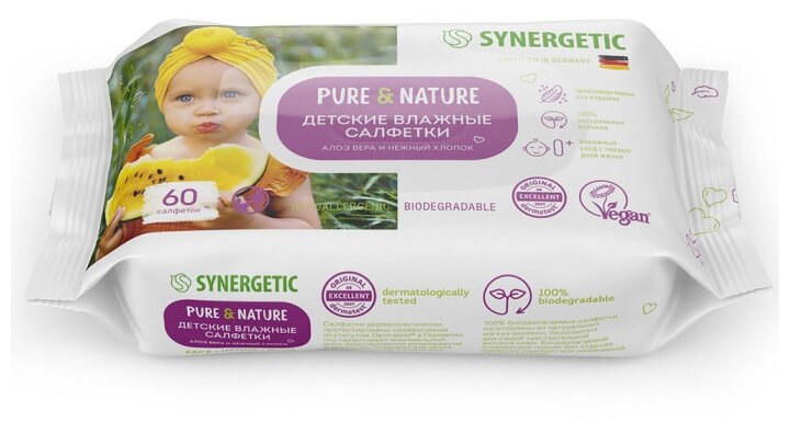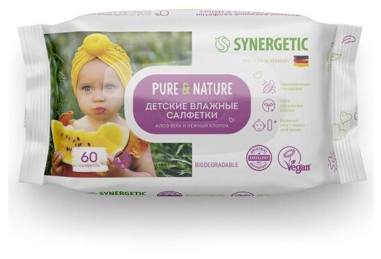 Детские влажные салфетки SYNERGETIC Pure&Nature «Алоэ вера и нежный хлопок» без отдушек, гипоаллергенные, биоразлагаемые, для новорожденных 0+, 60 шт.