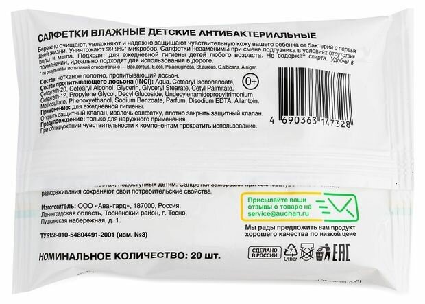 Влажные салфетки детские антибактериальные 0+, 20 шт информация: