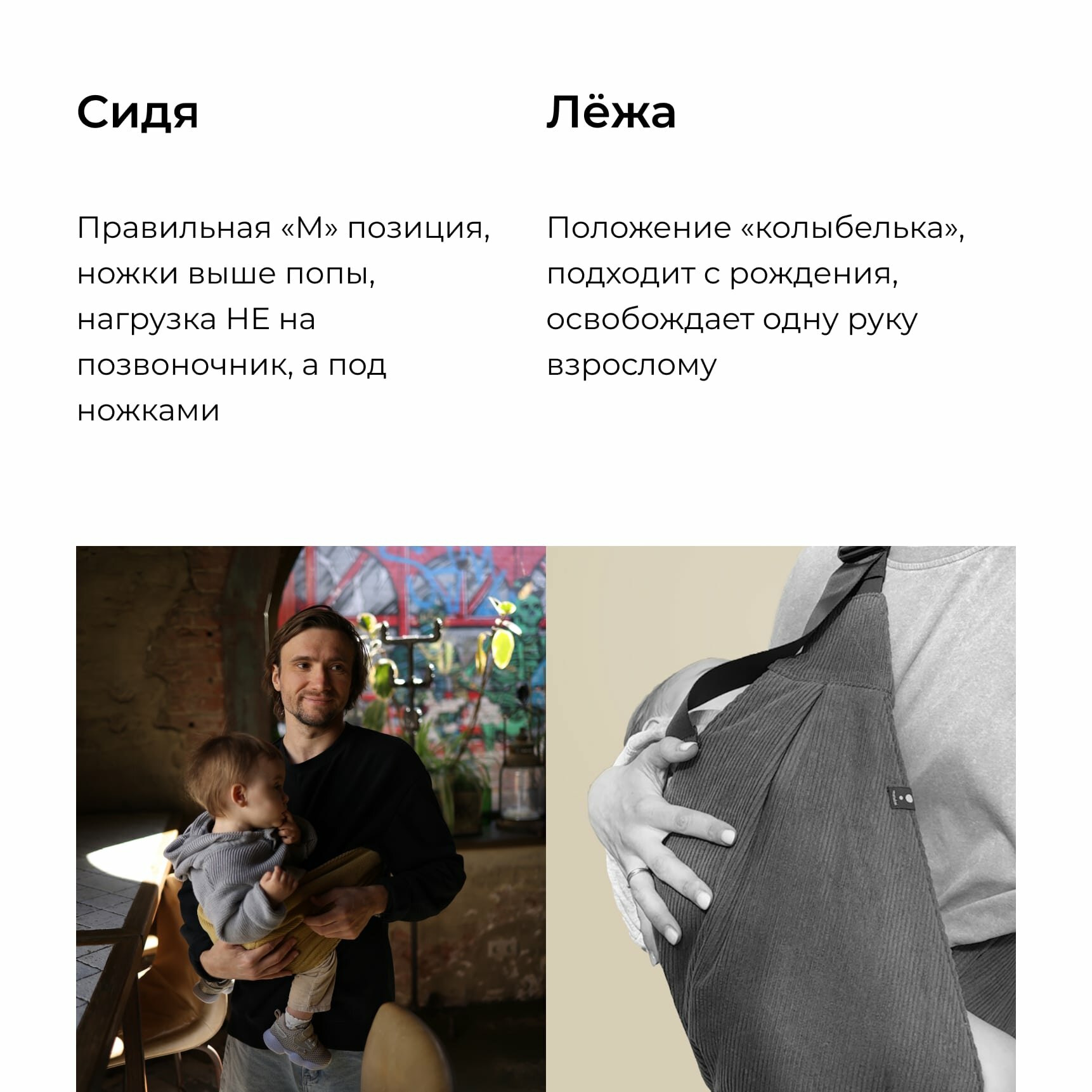 | Положение ребенка | в положении полулежа / сидя лицом к родителю |
