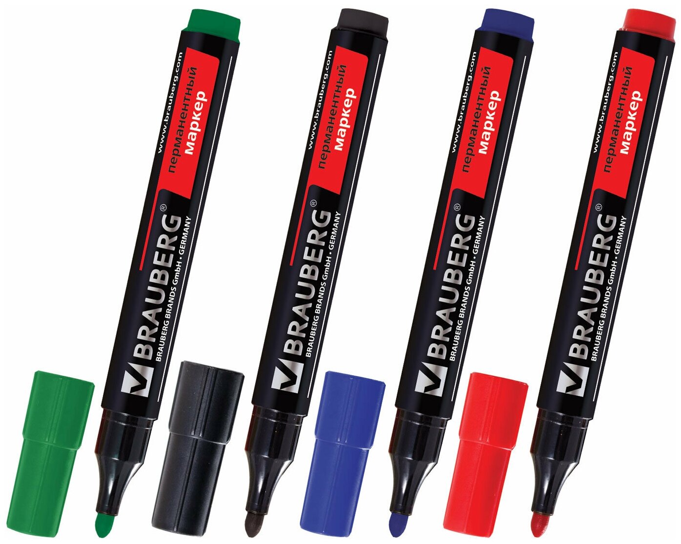 Маркеры перманентные Brauberg (нестираемые) набор 4 штуки, "Contract", без клипа, круглый 3 мм (синий, черный, красный, зеленый) (150474) информация:
