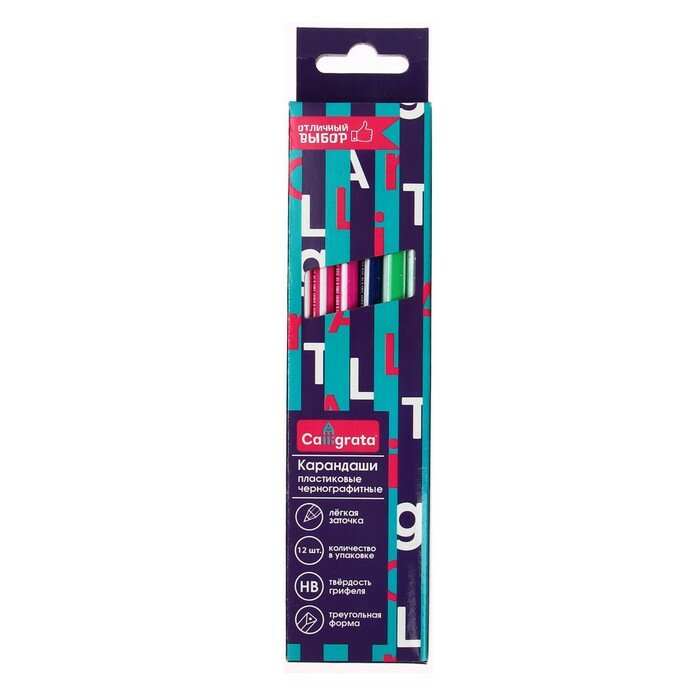 Карандаш чернографитный (простой) НB, Calligrata, заточенный, пластик, трехгранный с полоской, микс(12 шт.) информация: