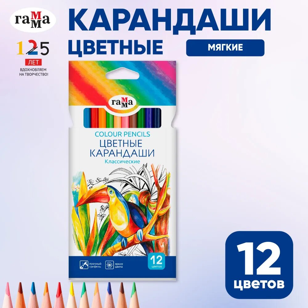 Цветные карандаши для школы 12 цветов для рисования мягкие / Школьный набор цветных карандашей Гамма "Классические"