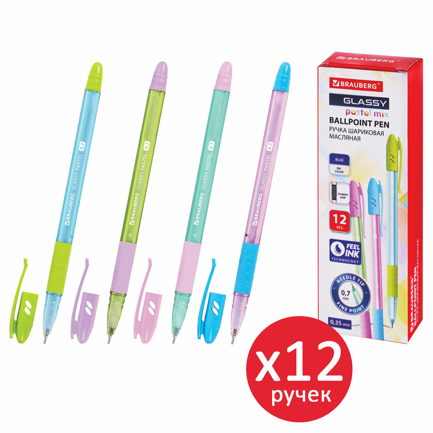 10 цен на Ручка шариковая BRAUBERG "GLASSY PASTEL MIX" синяя, комплект 12 штук, линия письма 0,35 мм