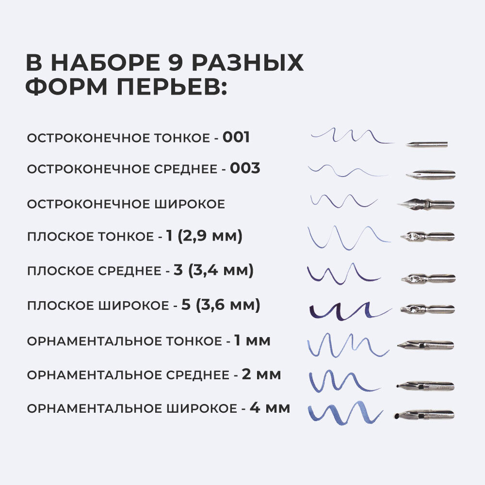 | Дополнительная информация | В прямом держателе есть два отверстия для перьев разного диаметра, что позволяет пользоваться самым тонким пером и всеми остальными. Перья в наборе предназначены для рисования, написания текстов, леттеринга и каллиграфии, создания орнаментов. Комплект протестирован каллиграфами и отлично подходит для знакомства с техникой каллиграфии и рисования тушью, позволяет попробовать различные виды перьев. |