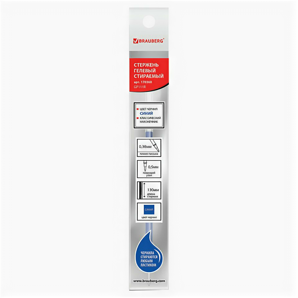 Стержень стираемый гелевый BRAUBERG 130 мм, синий, евронаконечник, узел 0,5 мм, линия письма 0,38 мм, 170360 (цена за 1 ед.товара) информация: