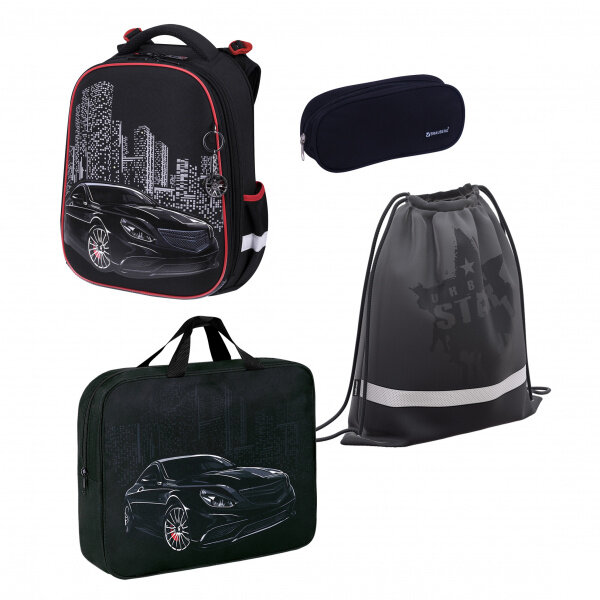 Ранец Brauberg Premium, 2 отделения, с брелком, "City car", LED лампочки + пенал + мешок для обуви + папка А4 текстиль информация: