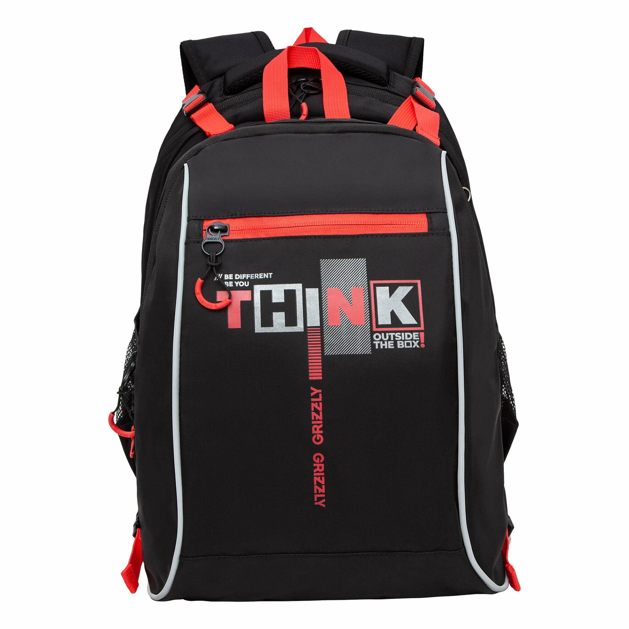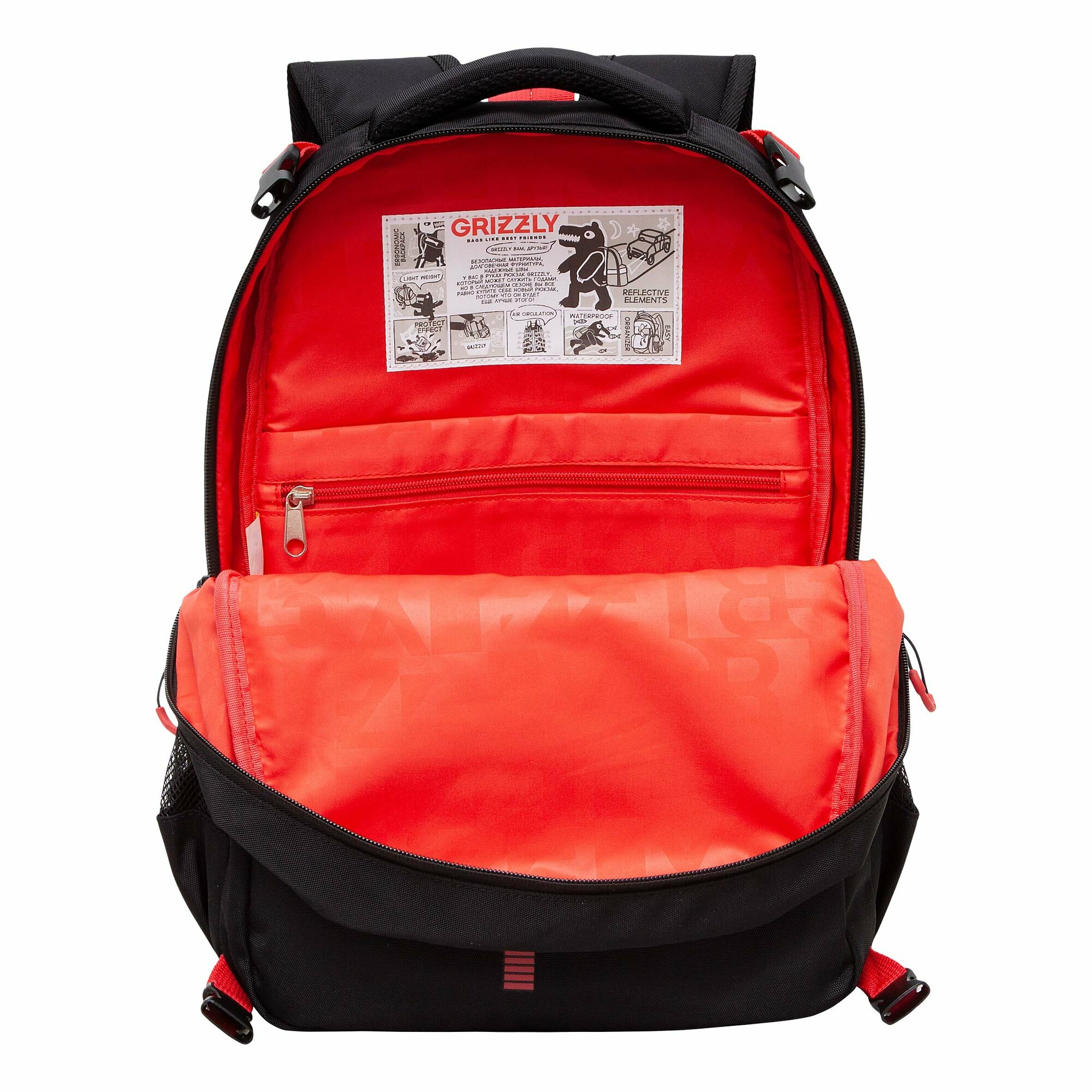 Школьный рюкзак с ортопедической спинкой GRIZZLY RB-458-1 черный-красный с мешком-рюкзаком для обуви, грудная стяжка, 2 отделения, 943грамм информация: