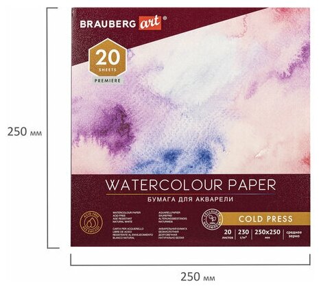 Альбом для акварели, бумага 230 г/м2, 250х250 мм, среднее зерно, 20 листов, склейка, BRAUBERG ART "PREMIERE", 113216