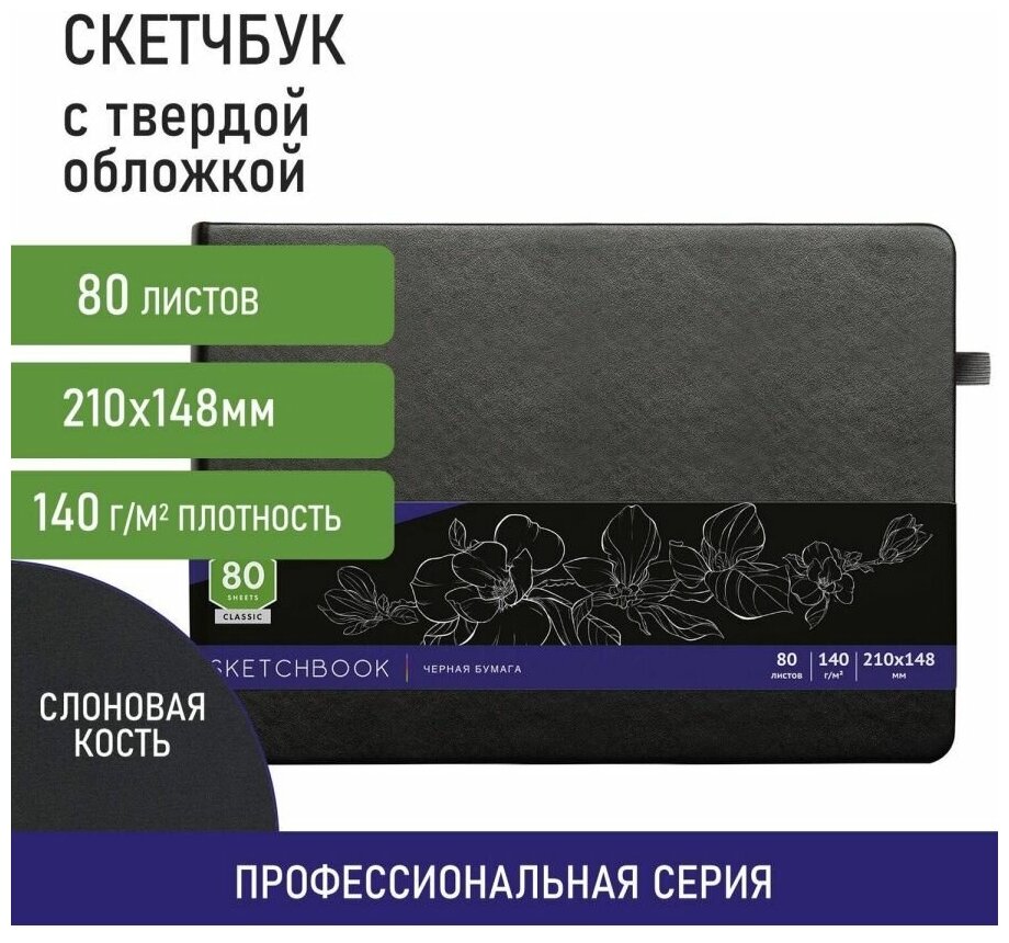 Скетчбук, черная бумага 140 г/м2, 210х148 мм, 80 л., кожзам, резинка, карман, BRAUBERG ART CLASSIC, черный, 113205
