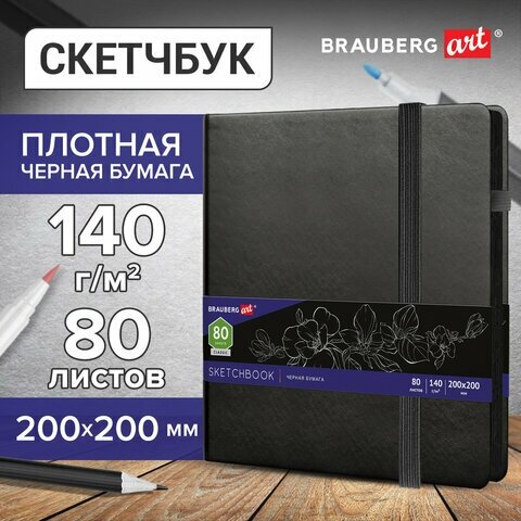 Скетчбук Brauberg Art, черная бумага, 140 г/м2 200х200 мм, 80 л, кожзам, резинка, карман, черный
