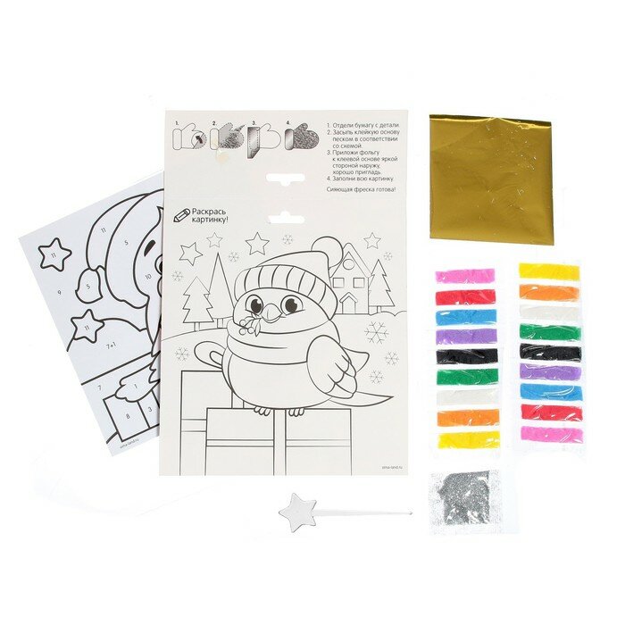 Комплект 46 шт, Аппликация из песка и блесток ТРИ совы "Змейка", с раскраской, пакет с европодвесом