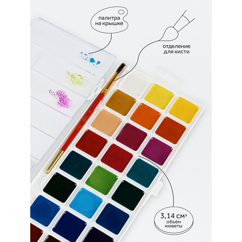 | Дополнительная информация | Краски изготовлены на основе органических пигментов и натурального связующего, отличаются прозрачностью, яркостью и чистотой цветов. Удобный пластиковый пенал: палитра для смешивания красок расположена на крышке, а кюветы с высокими бортиками и увеличенное расстояние между красками не позволяют цветам смешиваться в подложке во время рисования. |