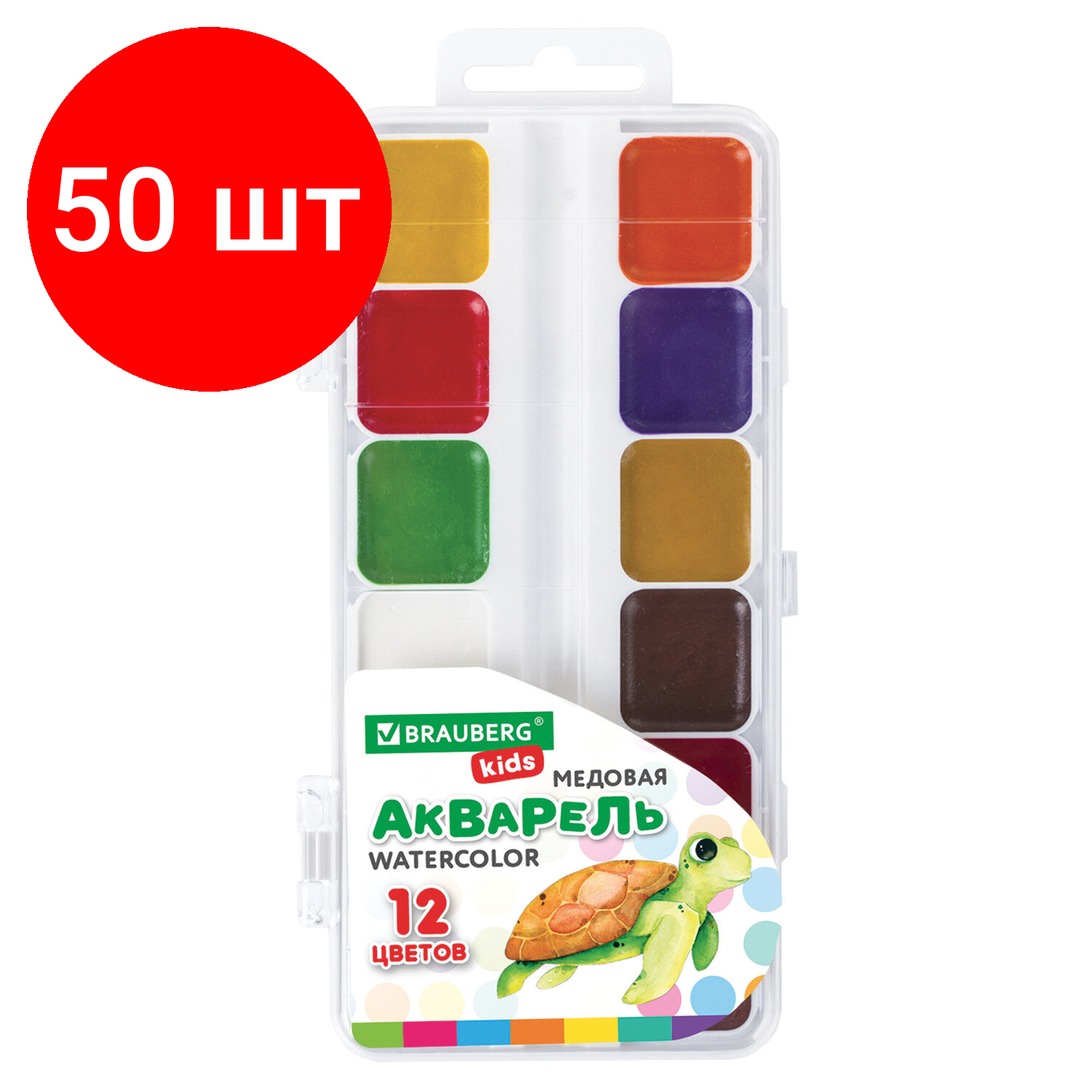 Комплект 50 шт, Краски акварельные BRAUBERG "KIDS", медовые, 12 цветов, квадратные кюветы, пластиковый пенал, 192282 информация: