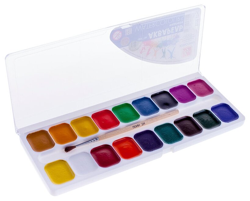 | Комплектация | Акварель медовая, 18 цветов с кистью, пластмассовая упаковка с прозрачной крышкой, европодвес. |
