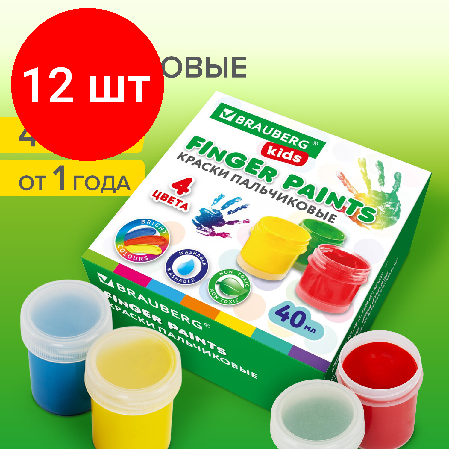 Комплект 12 шт, Краски пальчиковые для малышей от 1 года, 4 цвета по 40 мл, BRAUBERG "KIDS", 192278 информация: