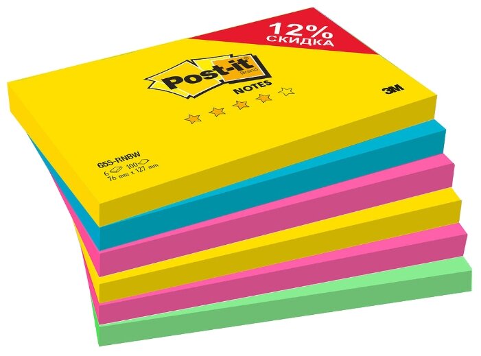 10 цен на Самоклеящийся блок Post-it "Радуга Плюс", 76*127мм, 4 цвета, 6 блоков*100л