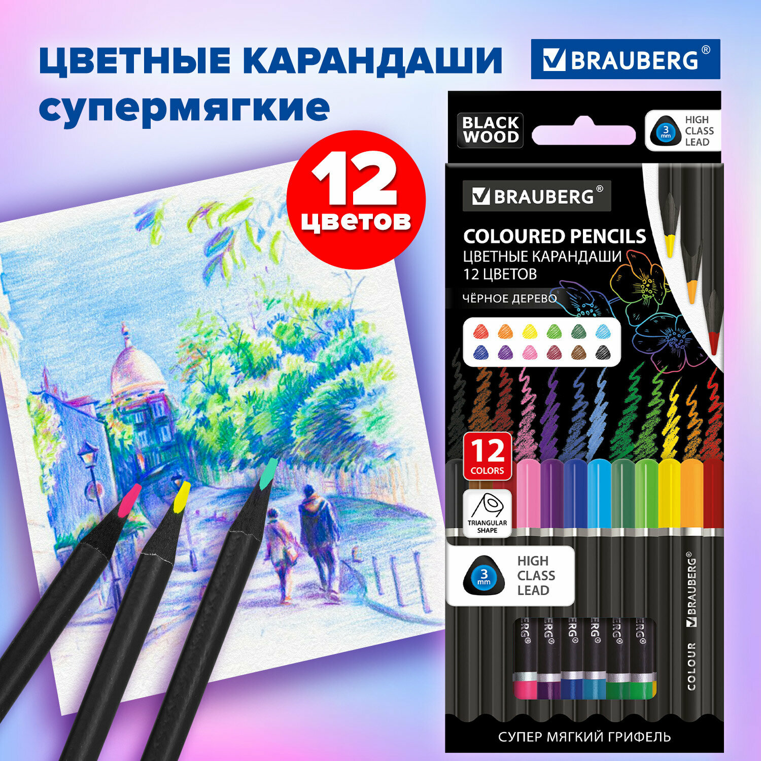 10 цен на Карандаши цветные чёрное дерево BRAUBERG BLACK WOOD, 12 цветов, трехгранные, мягкий грифель 3 мм, 181948