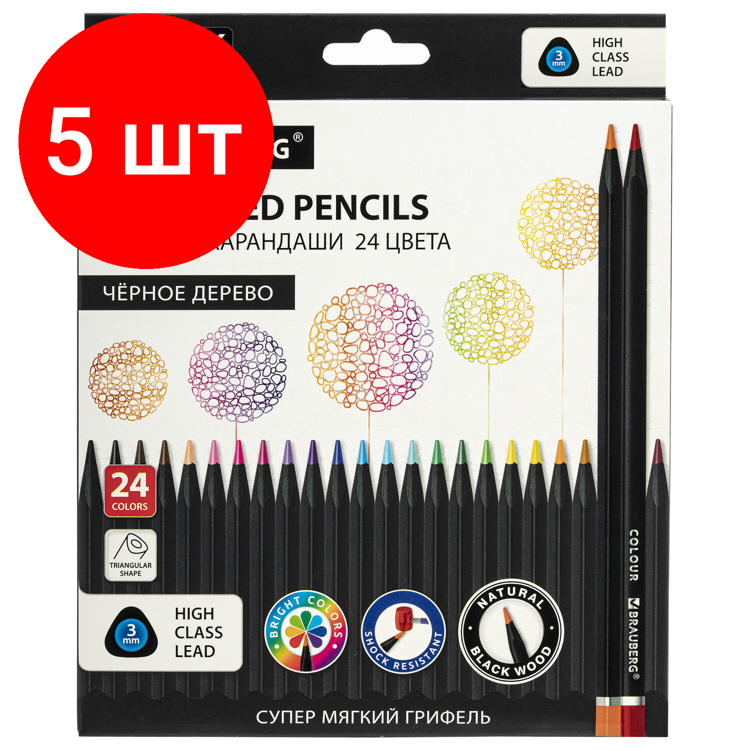 Комплект 5 шт, Карандаши цветные чёрное дерево BRAUBERG BLACK WOOD, 24 цвета, трехгранный корпус, грифель мягкий 3 мм, 181949 информация: