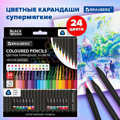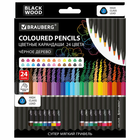 Карандаши цветные Brauberg "Black Wood", черное дерево, 24 цвета, трехгранный корпус, грифель мягкий 3 мм