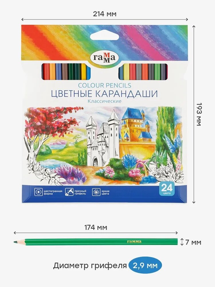 Карандаши цветные гамма "Классические", 24 цвета, заточенные, шестигранные, картонная упаковка