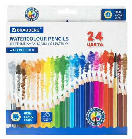 Карандаши цветные акварельные BRAUBERG 24 цвета с кистью, шестигранные, грифель 3 мм, натуральное дерево, 181849