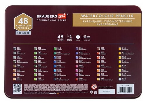 Карандаши Brauberg художественные цветные акварельные, 48 цветов, 4 мм, металлический кейс, ART PREMIERE, 181924