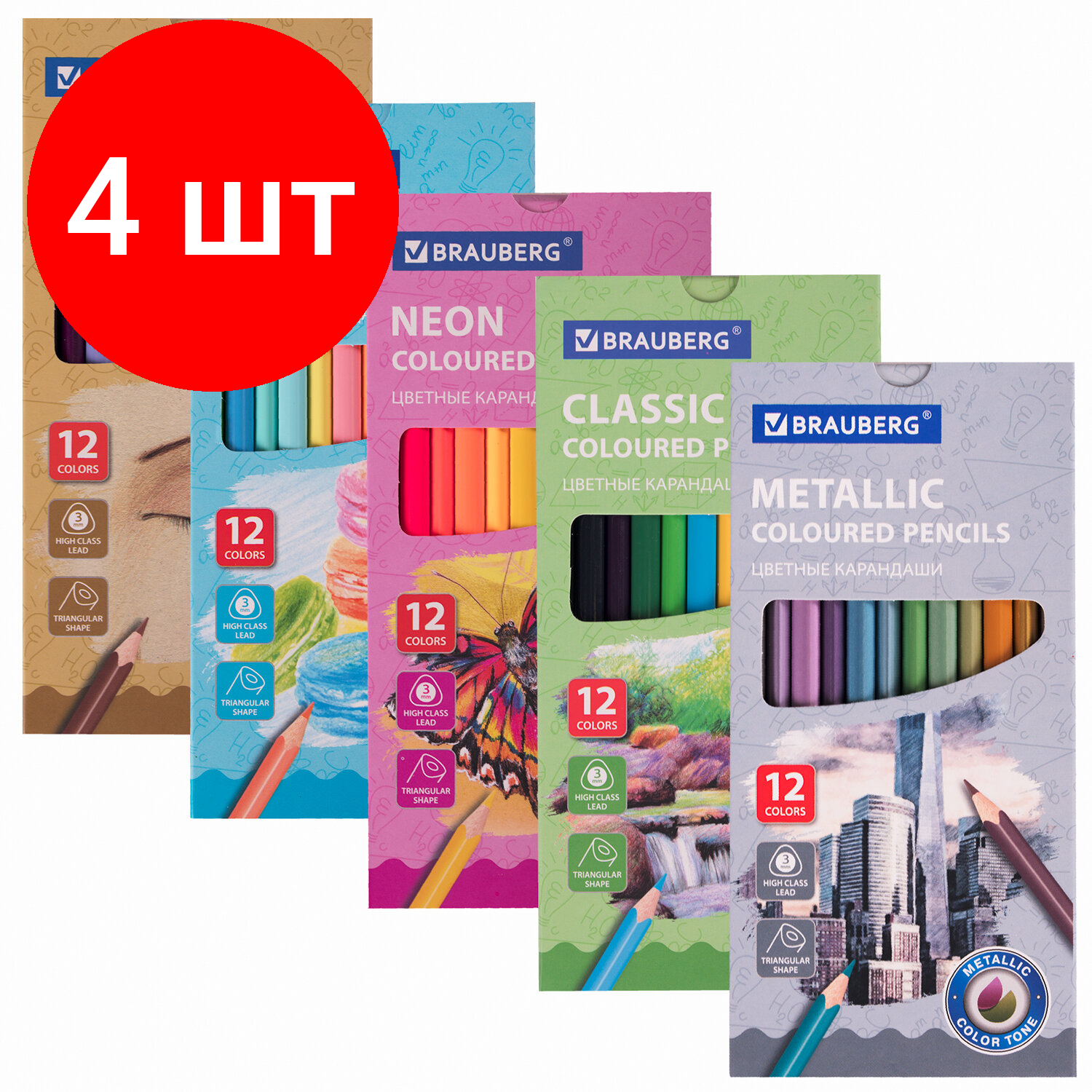 Отзывы на Комплект 4 шт, Карандаши цветные BRAUBERG, 60 цветов (Базовые, Металлик, Неон, Пастель, Телесные), 181792