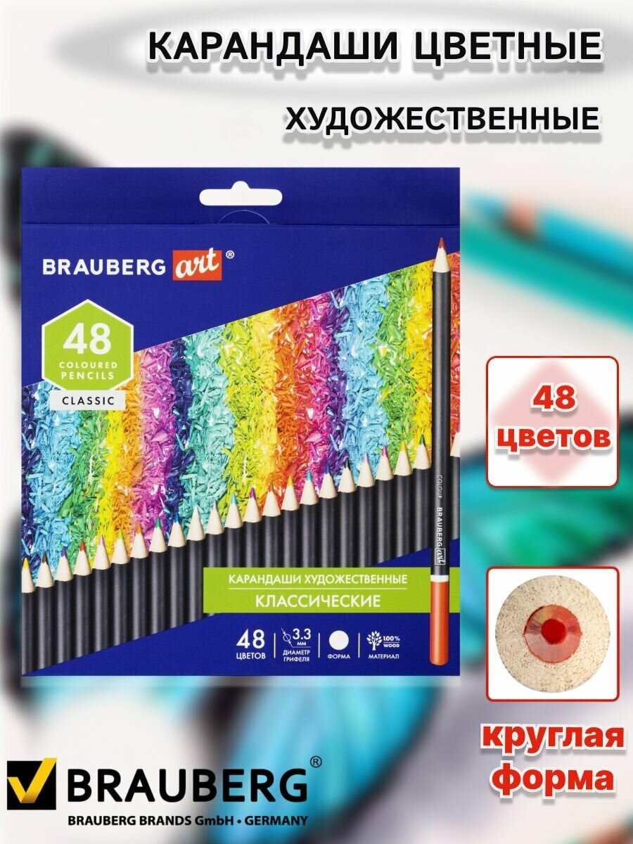 Карандаши художественные цветные акварельные BRAUBERG ART CLASSIC, 48 цветов, грифель 3.3 мм, 181532