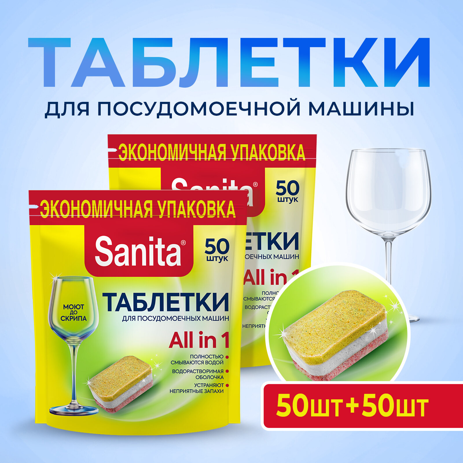 Таблетки SANITA для посудомоечных машин, 50 штук (комплект из 2 шт) информация:
